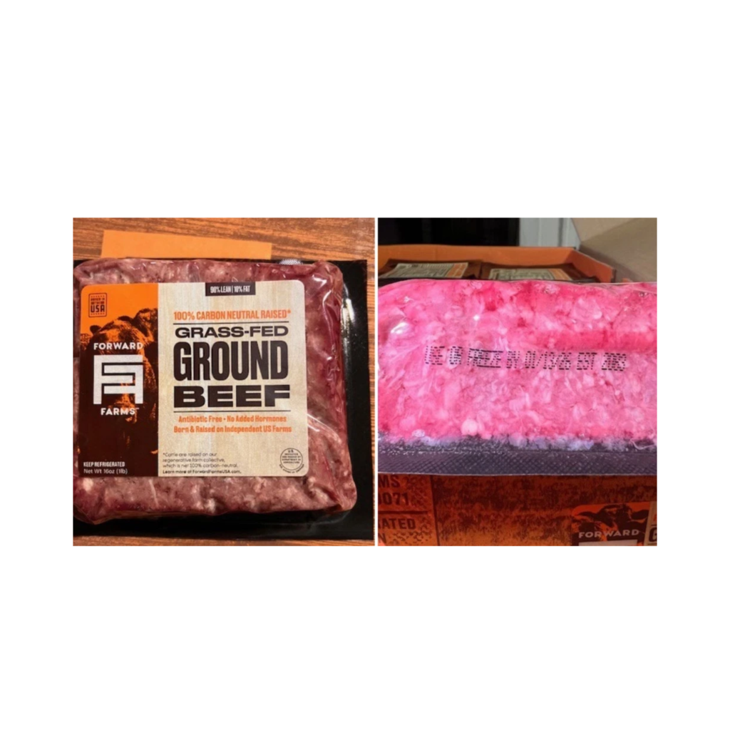 Photo of Forward Farms Grass-Fed Ground Beef packaging similar to the recalled product. Check labels for “Use or Freeze By Jan. 13, 2026” and “EST 2083” to identify affected packages